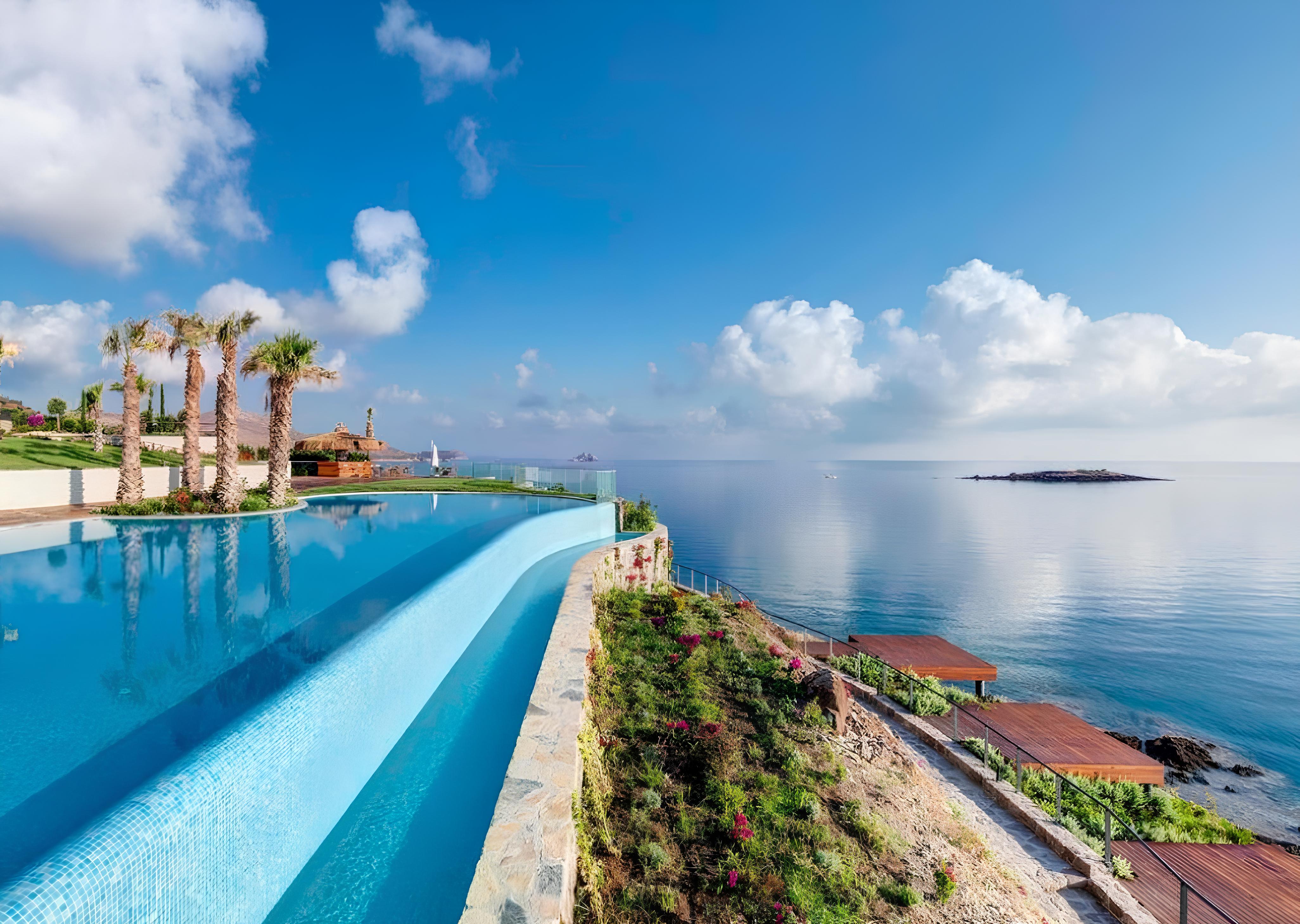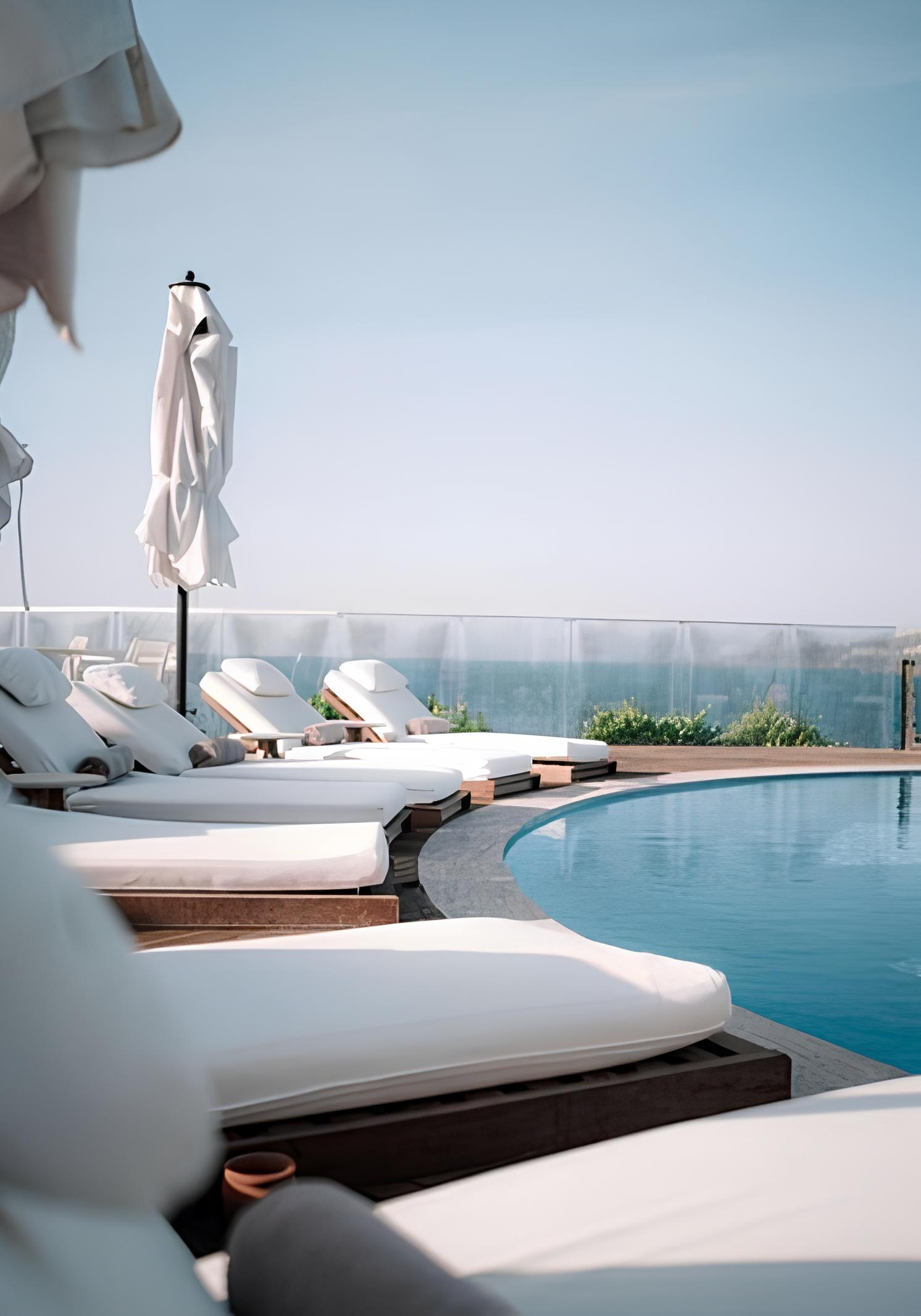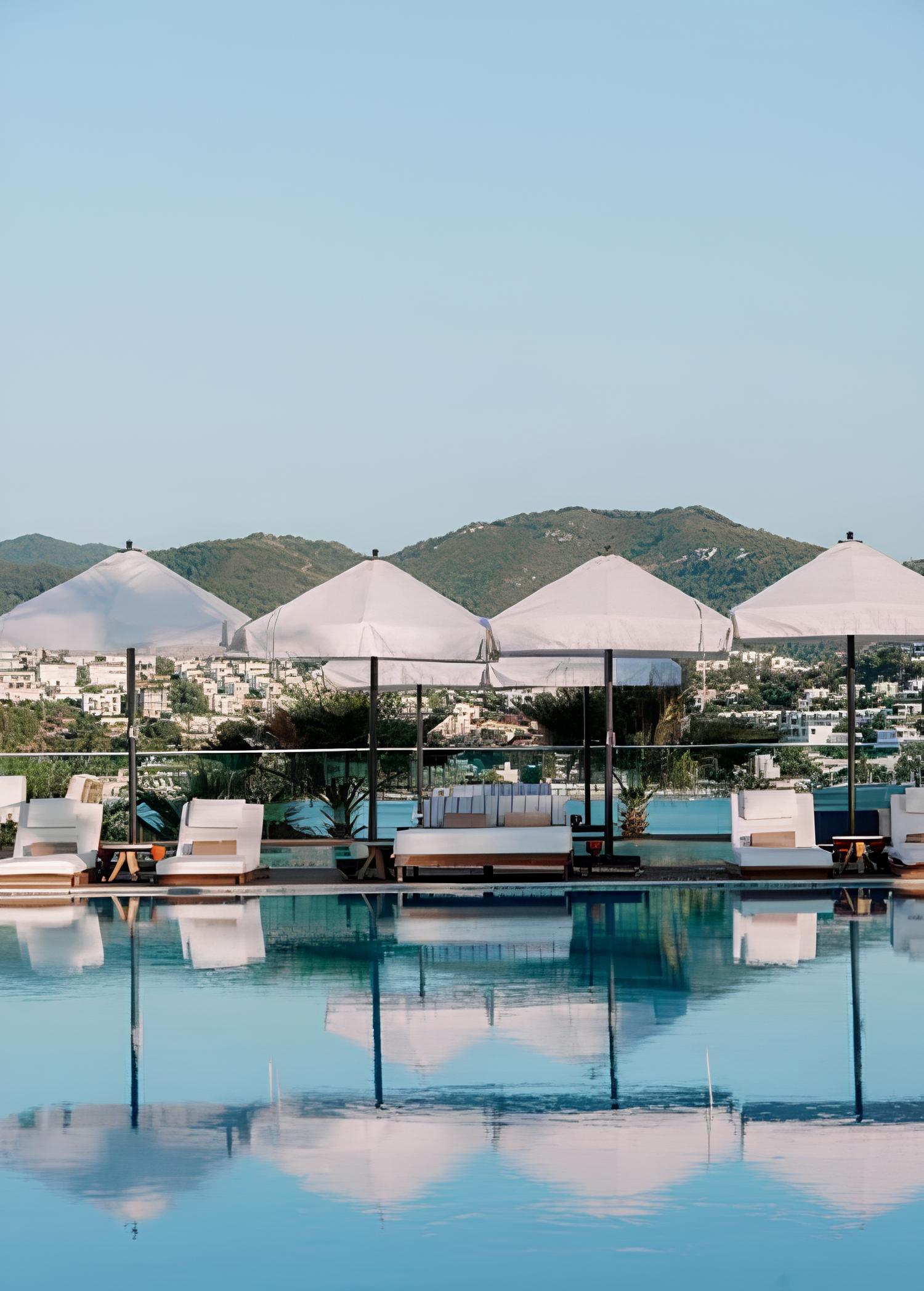 The pool area blends seamlessly with nature. Architectural elements around the poolside harmonize with the surrounding landscape. This space offers a perfect balance of aesthetics and functionality, creating a living environment in tune with nature.