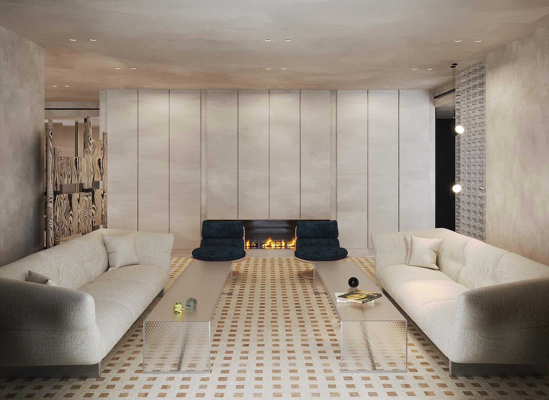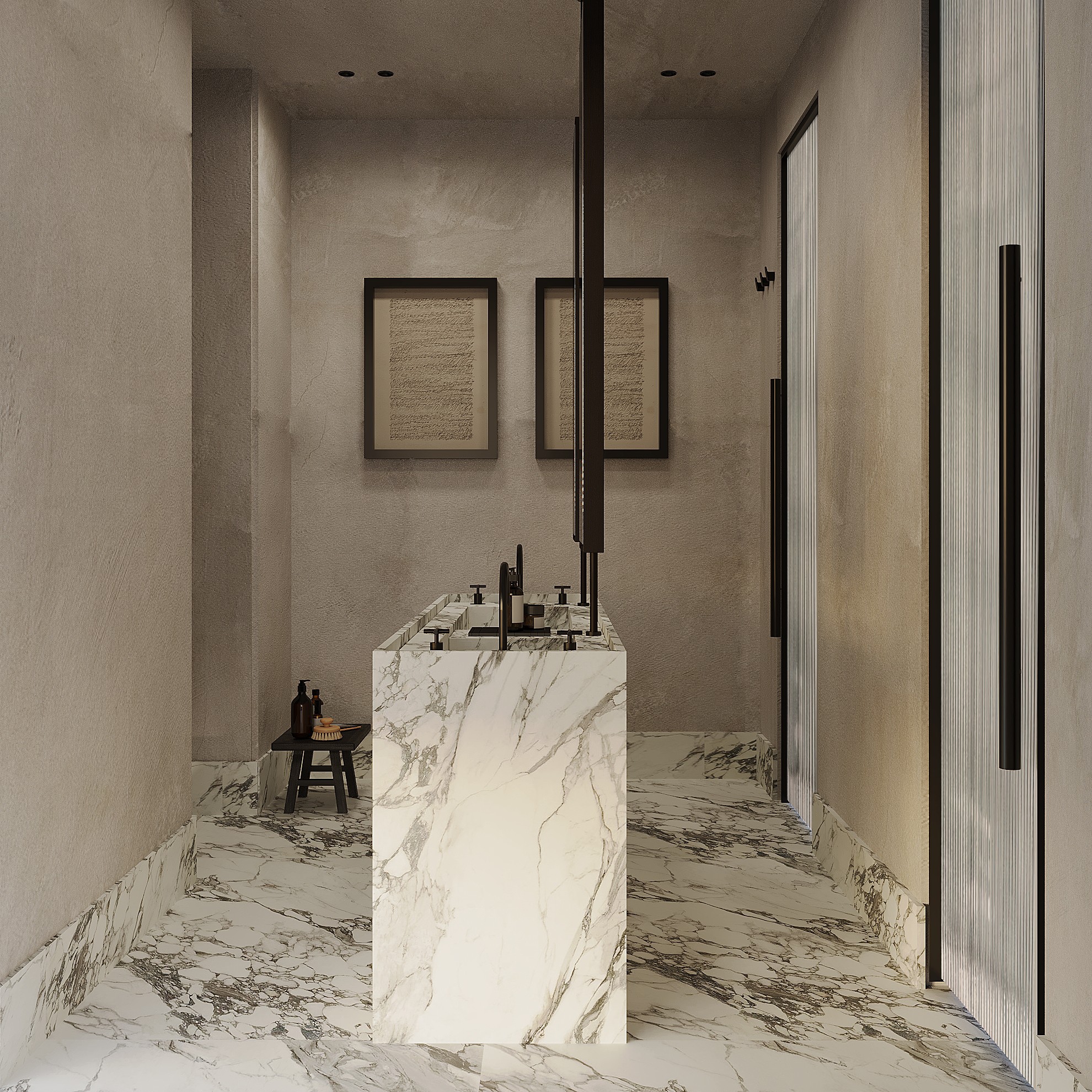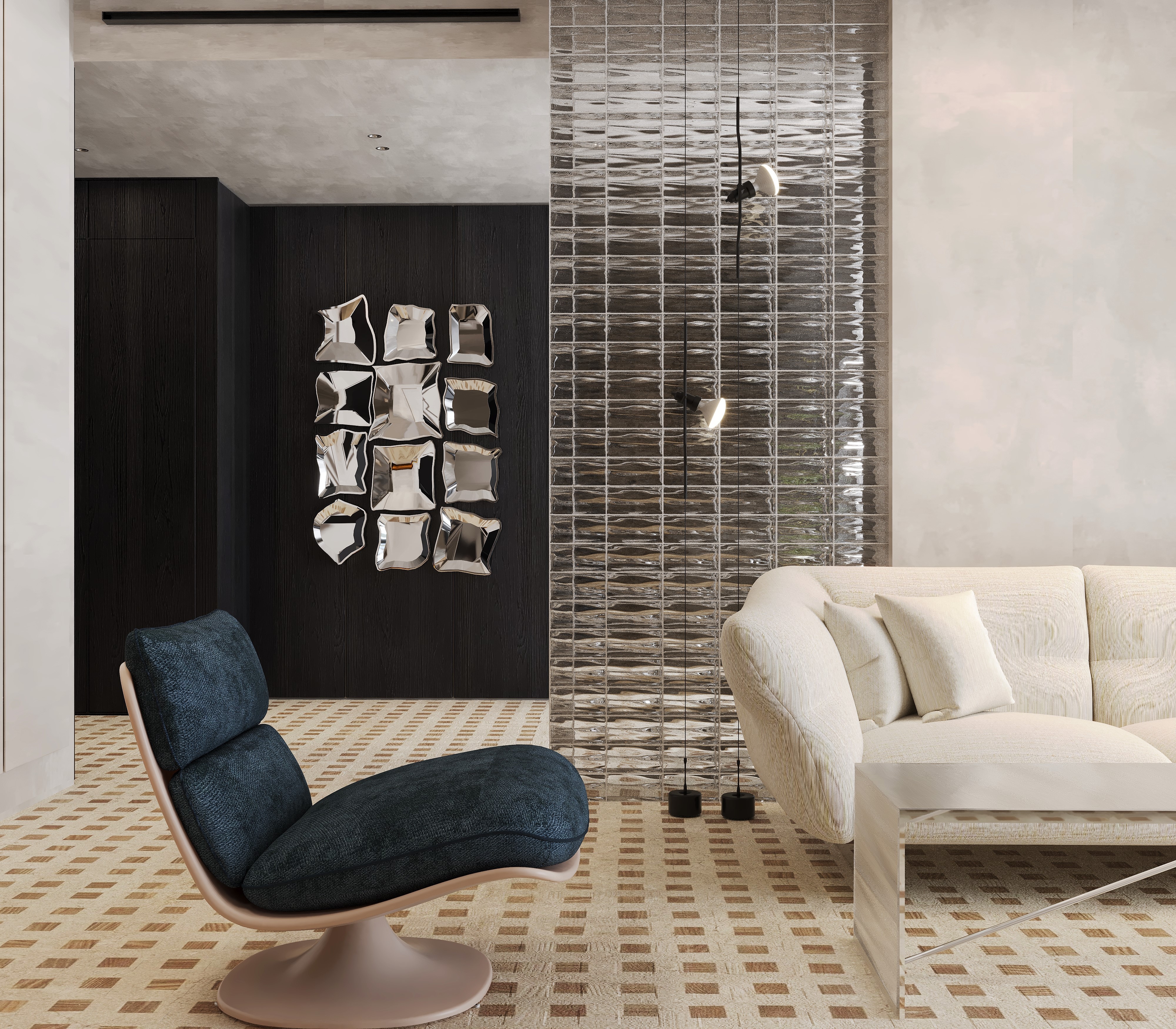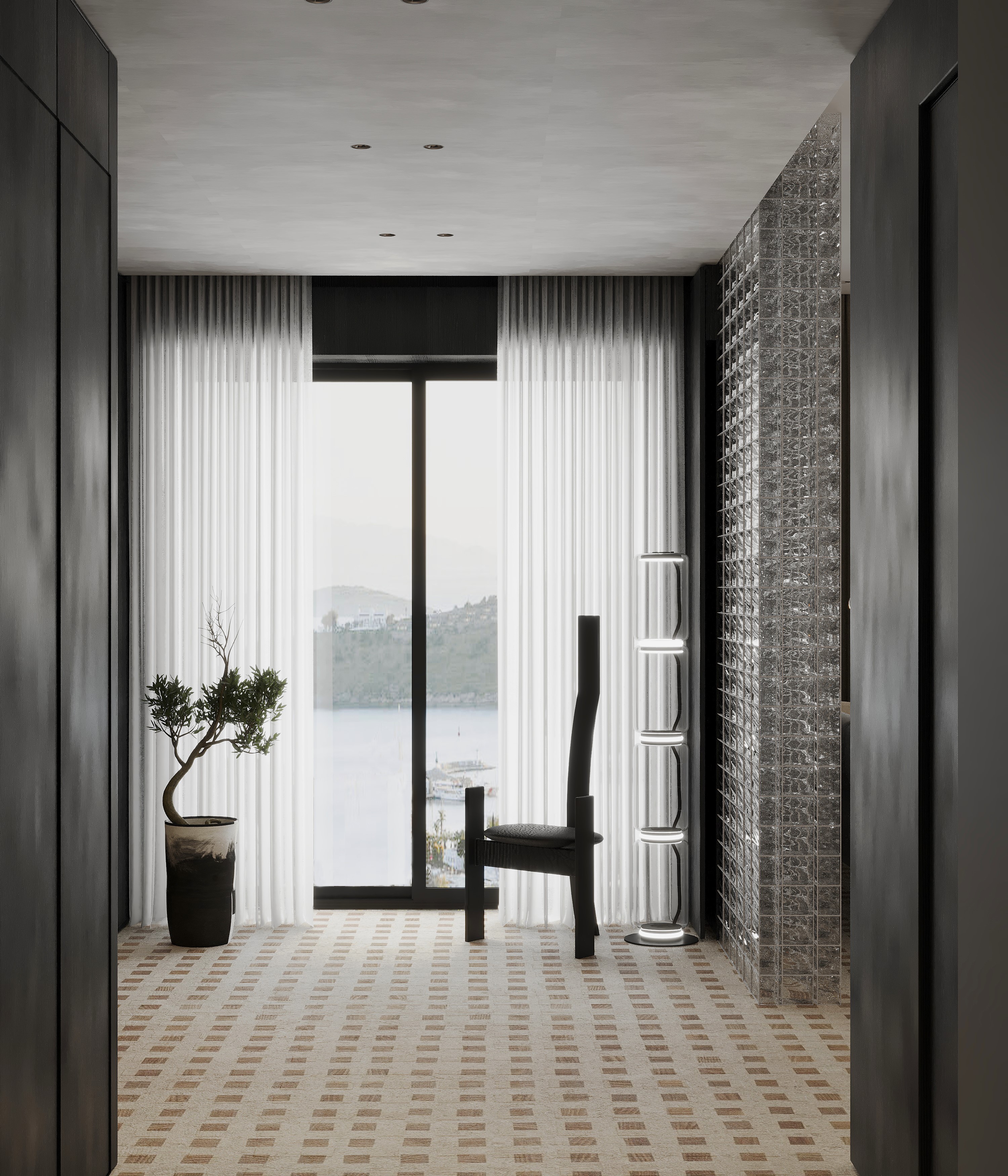 By leveraging high contrast between dark surfaces and light, minimalist decor elements, Tua Studio creates a harmonious balance that highlights the beauty of simplicity. The design emphasizes clean lines and thoughtful spatial composition, allowing each piece to stand out while maintaining a sense of calm and elegance. The minimalist furniture choices complement the sleek aesthetic, while the patterned flooring enhances the atmosphere, creating a harmonious balance between form and function.