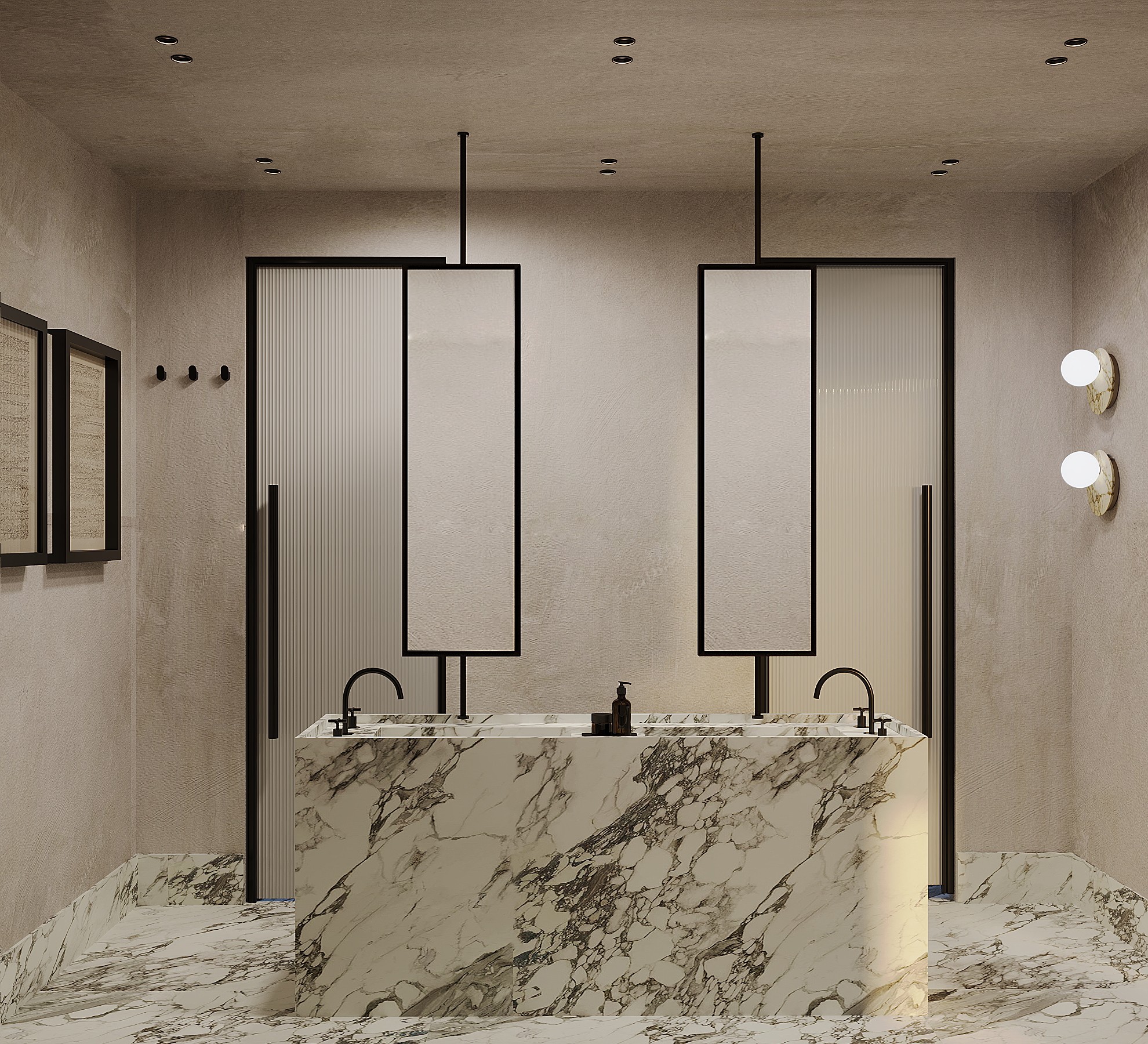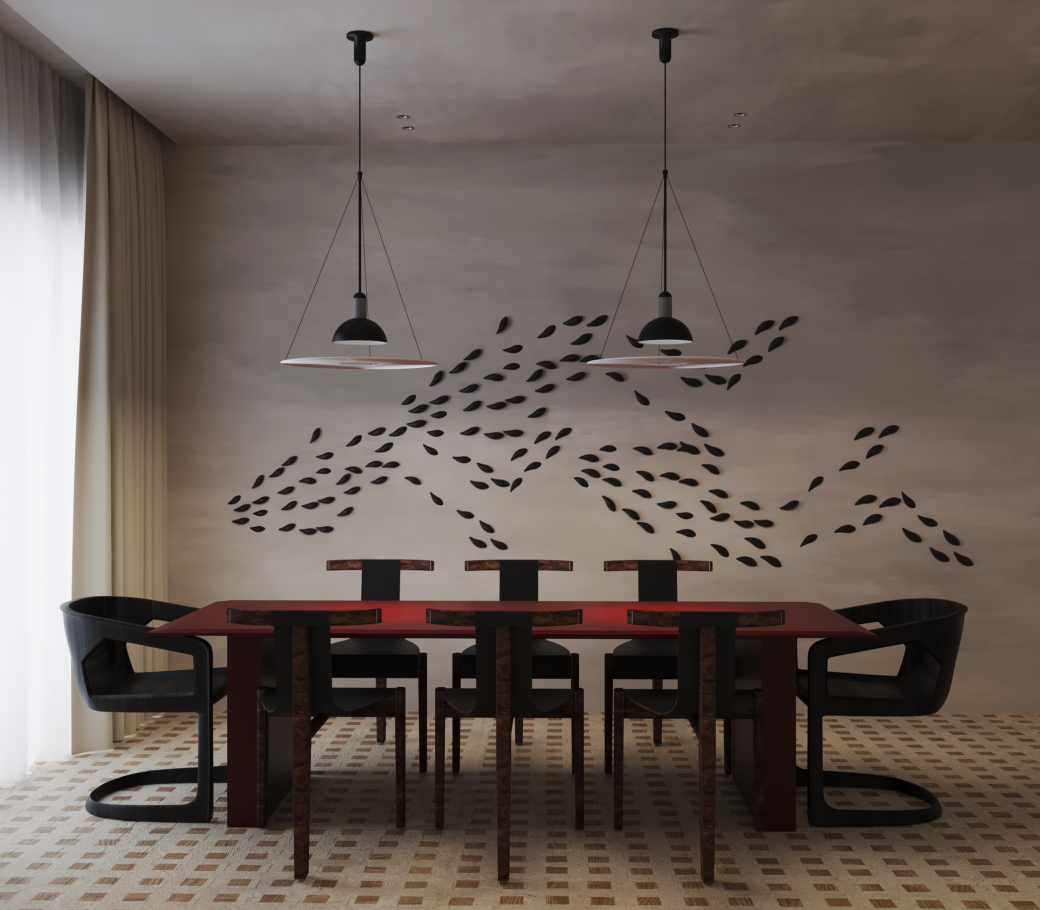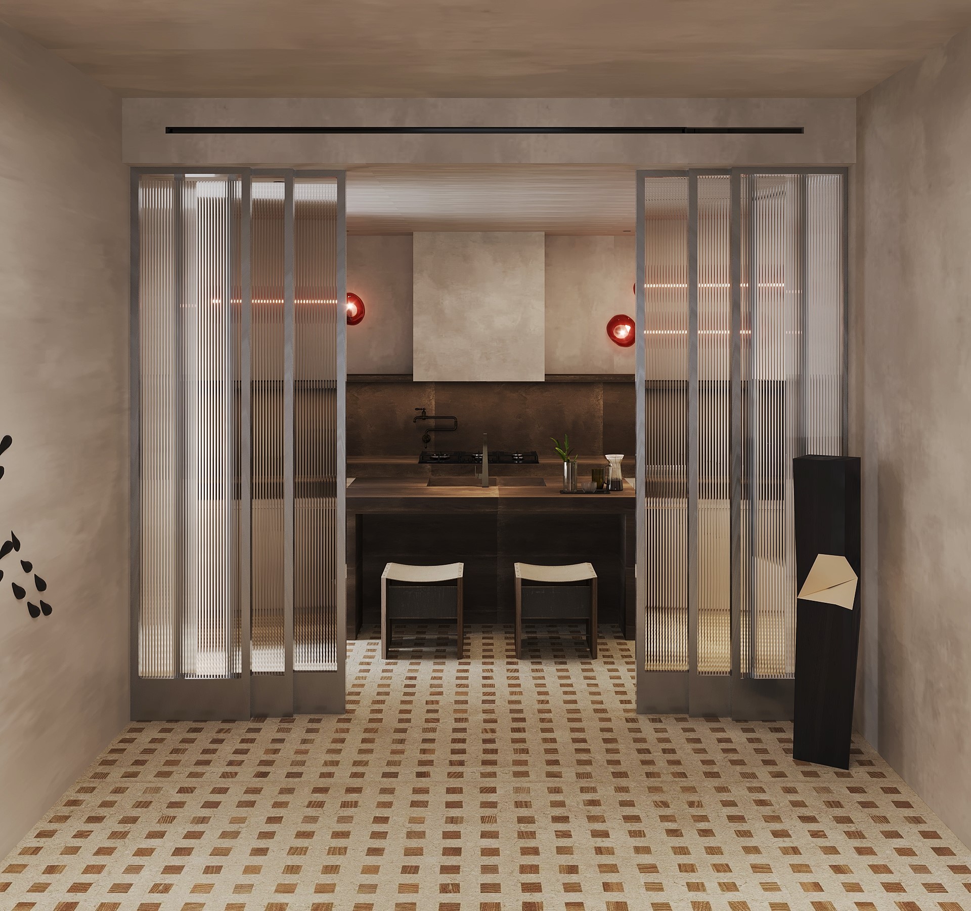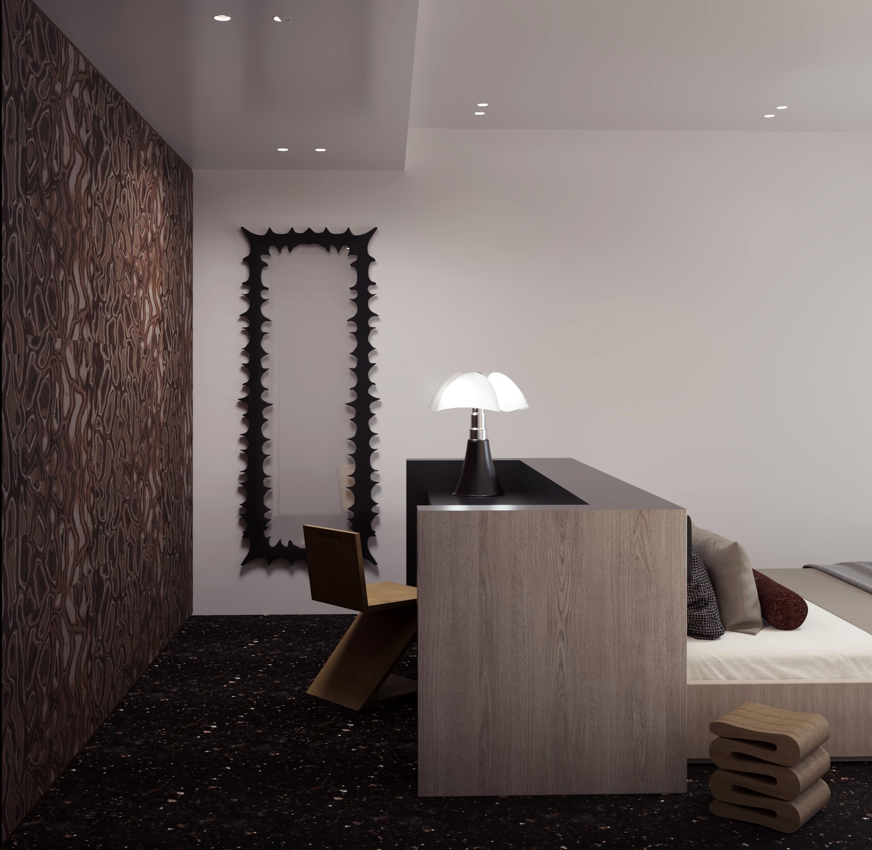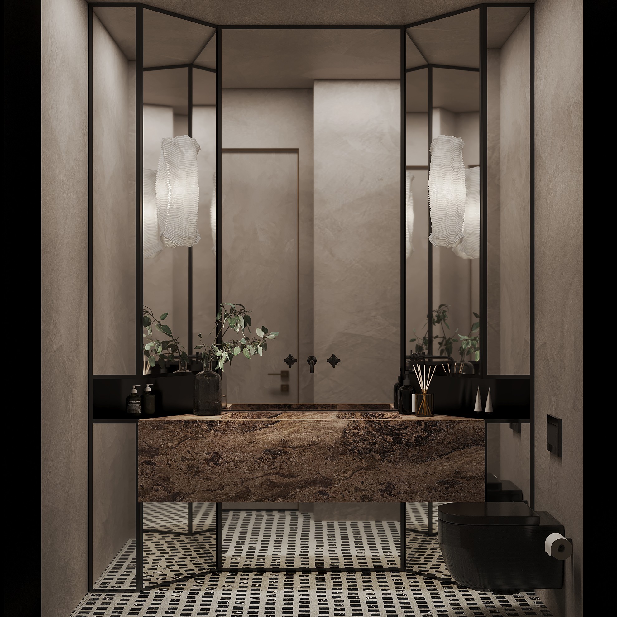 By leveraging high contrast between dark surfaces and light, minimalist decor elements, Tua Studio creates a harmonious balance that highlights the beauty of simplicity. The design emphasizes clean lines and thoughtful spatial composition, allowing each piece to stand out while maintaining a sense of calm and elegance. The minimalist furniture choices complement the sleek aesthetic, while the patterned flooring enhances the atmosphere, creating a harmonious balance between form and function.