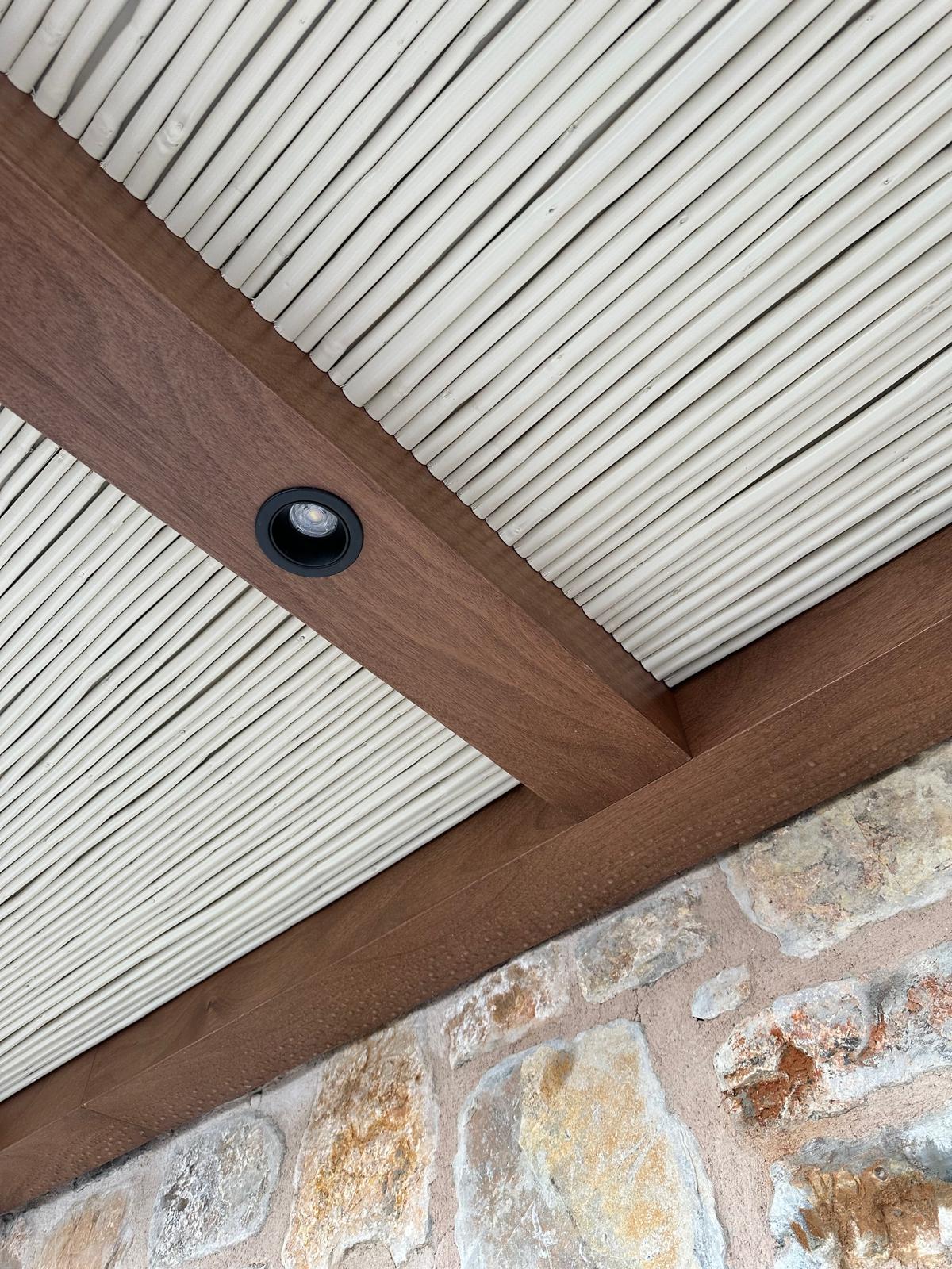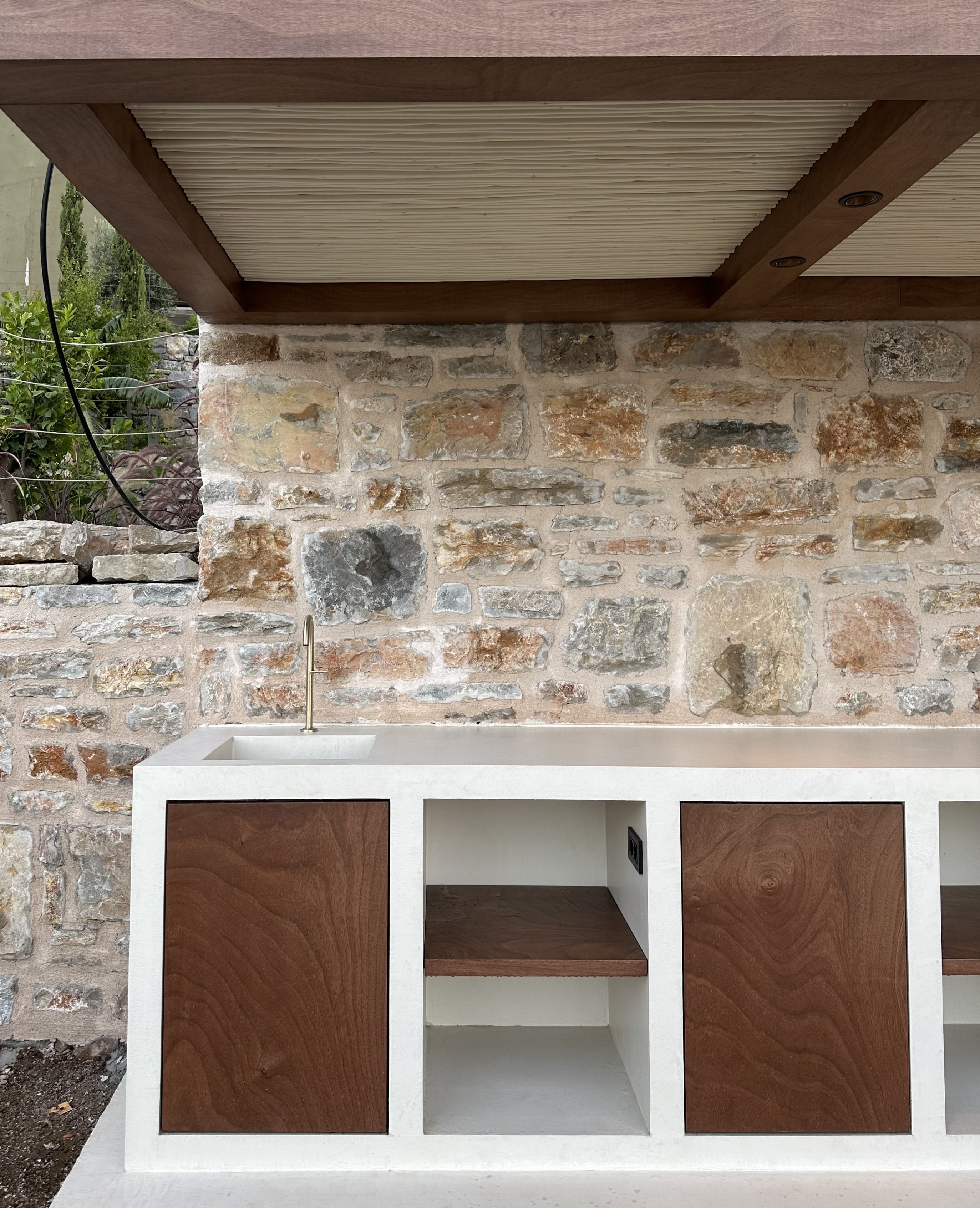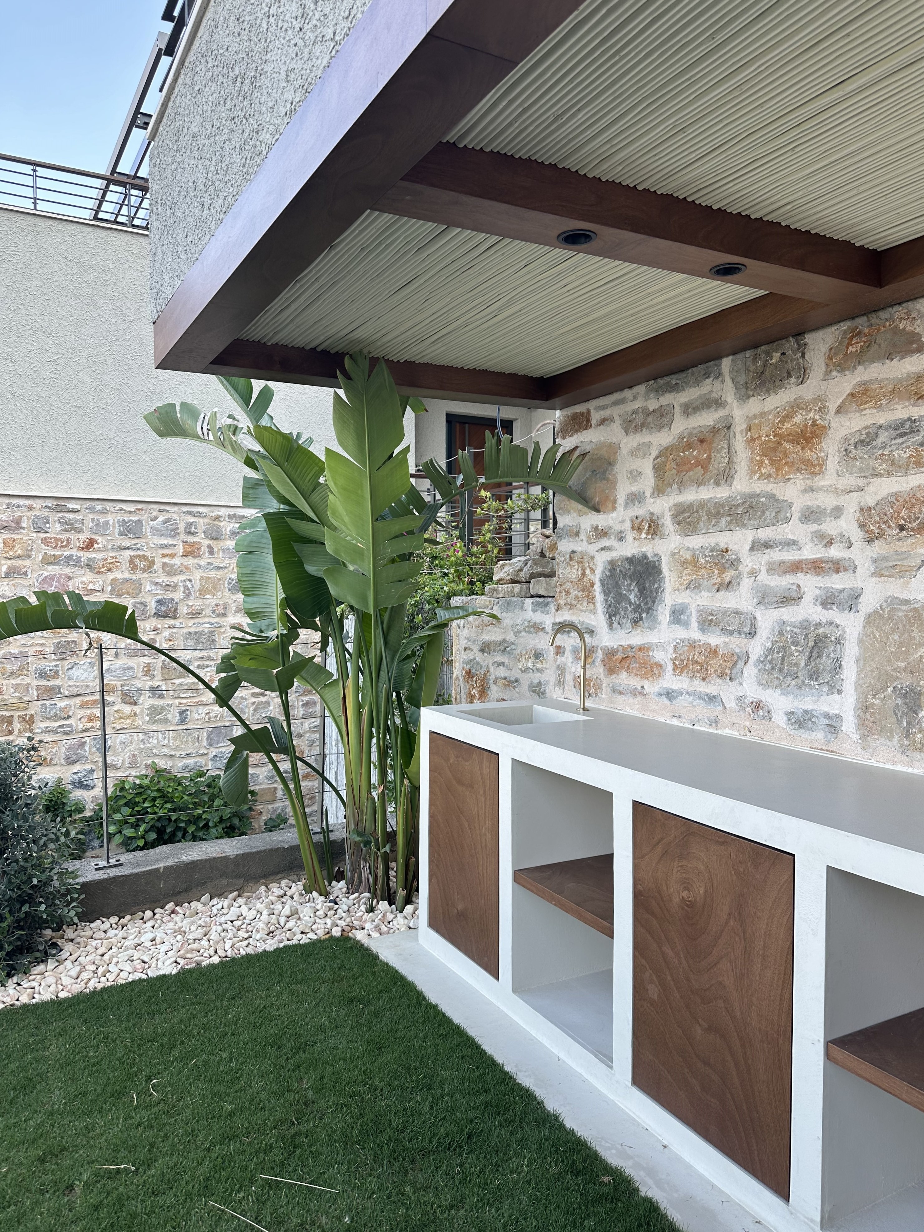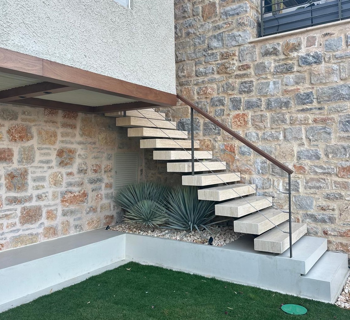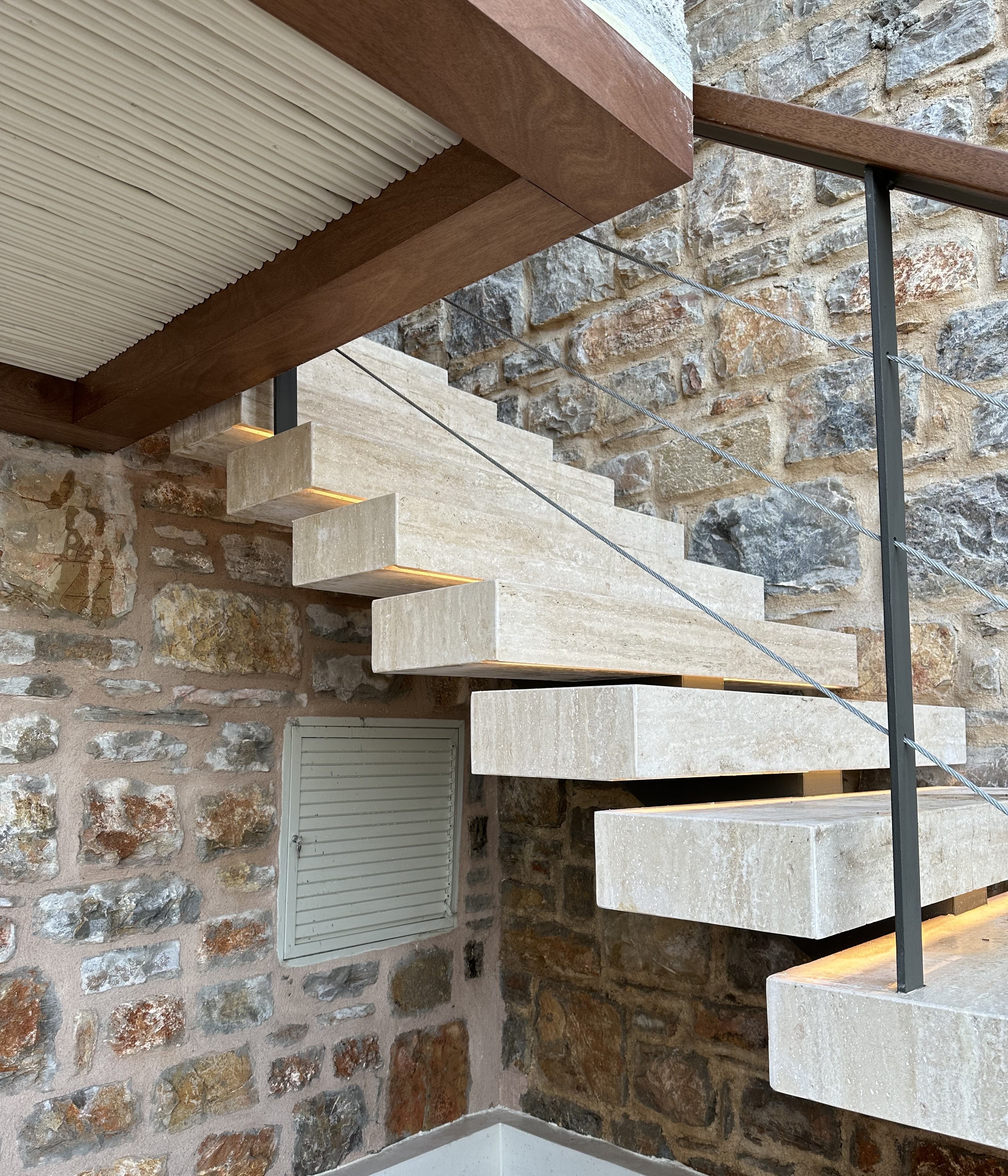 A simple yet functional outdoor unit in harmony with the natural stone texture. Simplicity in design, precision in details. The staircase connects the garden's different level with a clean form and materials that match the natural stone wall. The built-in planter turns an unused space into an elegant design element, creating a stronger bond between architecture and nature.